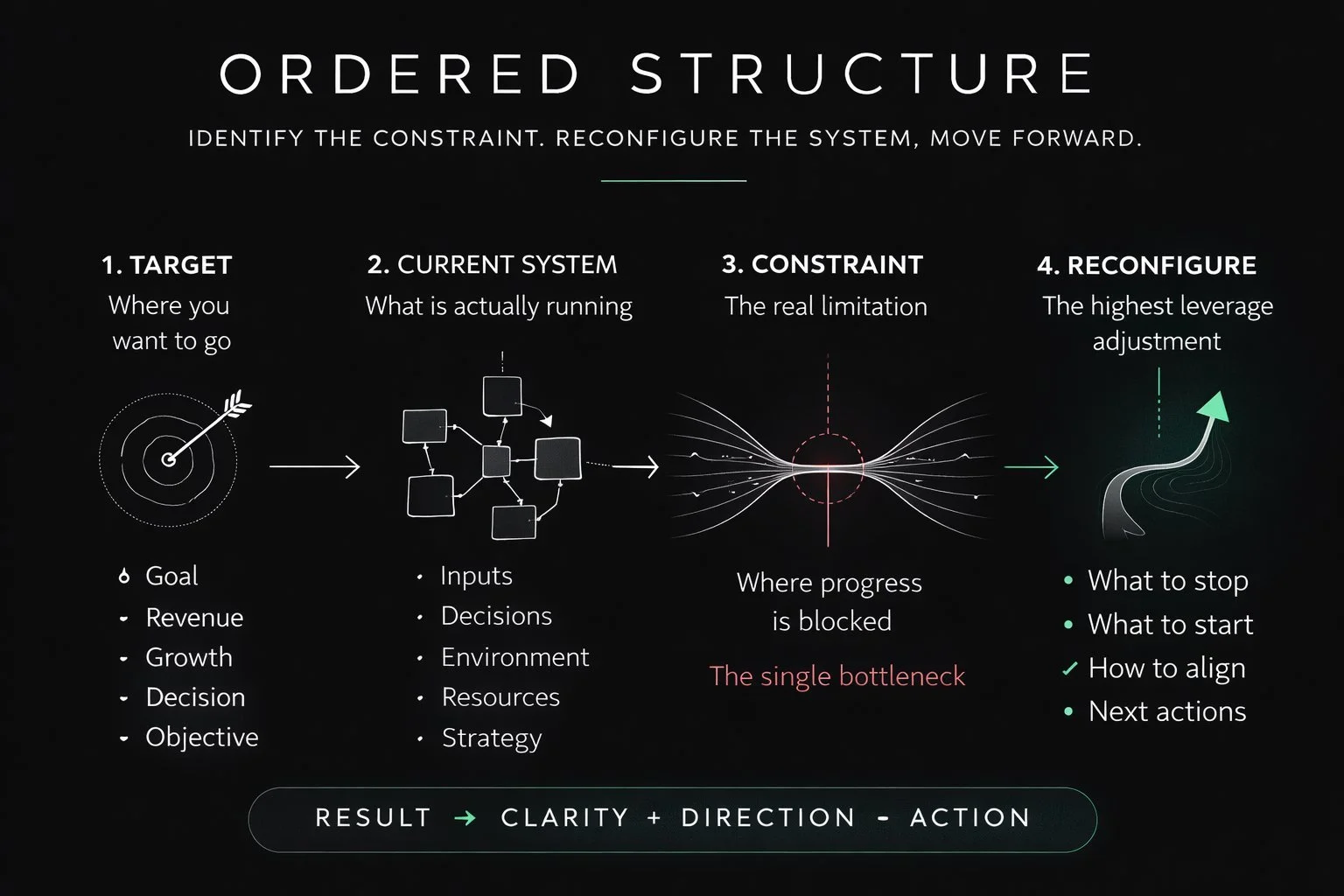 Ordered Structure provides focused diagnostic sessions designed to identify the structural constraint within a system.